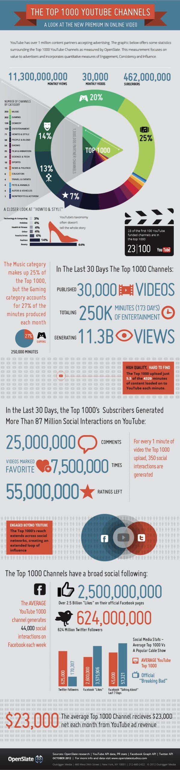 With 60 more YouTube Original Channels on the way, now is as good a time as any to take a closer look at the top-performing YouTube channels. The video sharing site has thousands of Partners, but the folks over at OpenSlate have synthesized the one thousand most influential and wide-reaching ones into a neat infographic that displays, among other things, the views, comments, and reach generated by YouTube’s most popular creators.