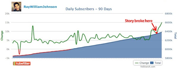 Here’s a chart from VidStatsX that illustrates the recent subscriber rise: