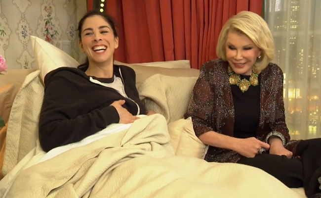 Rivers’ first guest is comedienne Sarah Silverman, who snuggles up under the covers to tell Joan about writing jokes. The TV icon has a grandmotherly vibe (albeit a grandmother who’s had a martini or two) and Silverman claims to want “the full mommy experience,” playing up a childlike innocence. The banter between the pair is free-flowing and easy, and it could have just as easily been contained within a podcast. Of course, in that format, we wouldn’t be able to look at Rivers’ beautiful face.