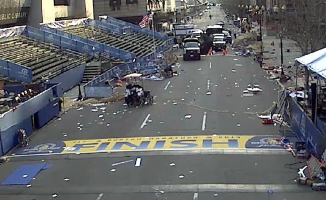 CBS Boston’s live stream of the finish line is still up and running, depicting the evacuated aftermath of the explosions with emergency vehicles in the background and an American flag still waving in the wind.