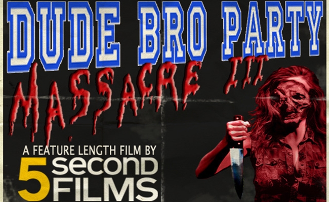 The Dude Bro Party Massacre 3 episode was released in 2009. It features an inverted slasher film plot so ridiculous that 5SF made a full trailer for it in 2010. Now, should the group raise $200,000 by July 1st, it will release a 5,400-second (i.e. 90 minutes) collage of dudes, bros, parties, and massacres.