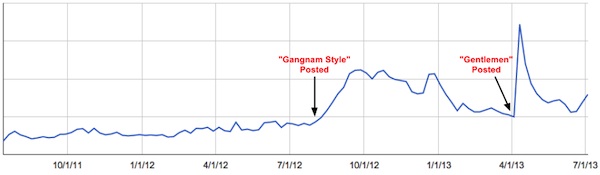 Kevin Allocca at YouTube Trends aggregated some interesting data to mark the one year anniversary of Gangnam Style and the impact Psy has had on his peers. The numbers reveal views of K-Pop music videos have increased threefold on the online video sharing since Gangnam Style‘s debut. Here’s what that looks like on a line graph: