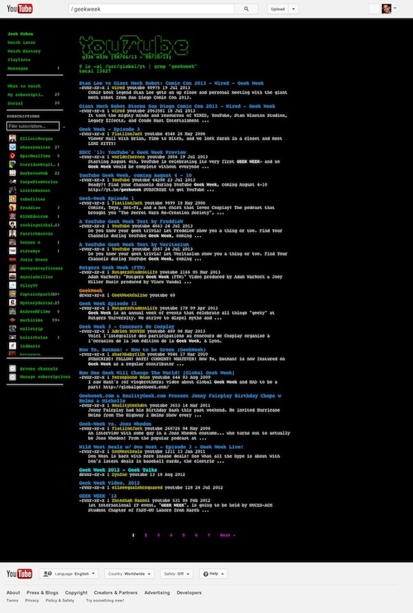 Individuals with a penchant for cryptography were able to crack the string of digits and, after inputting the result into YouTube’s search bar, were greeted with an old school, BBS, ASCII iteration of the site. If you want to see it too (Spoiler Alert), simply type in “/ geekweek” into the YouTube search bar. In fact “/ (insert whatever search term you like)” will work, too.