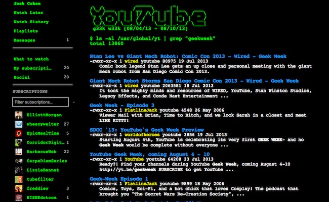 Individuals with a penchant for cryptography were able to crack the string of digits and, after inputting the result into YouTube’s search bar, were greeted with an old school, BBS, ASCII iteration of the site. If you want to see it too (Spoiler Alert), simply type in “/ geekweek” into the YouTube search bar. In fact “/ (insert whatever search term you like)” will work, too.