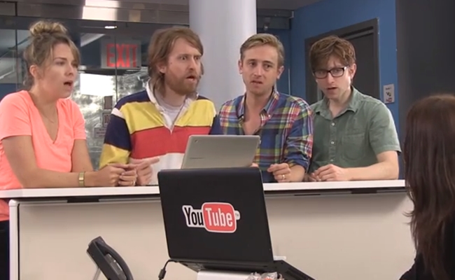 The video stars Laura McDonald as the YouTube Receptionist, who must address pressing complaints lodged by The Gregory Brothers, Prank vs. Prank, Hannah Hart, Beth Hoyt, and others. As with last year’s version, most of the complaints result in very cheesy riffs on a basic ‘what would happen if YouTube behavior occurred in real life’ joke.