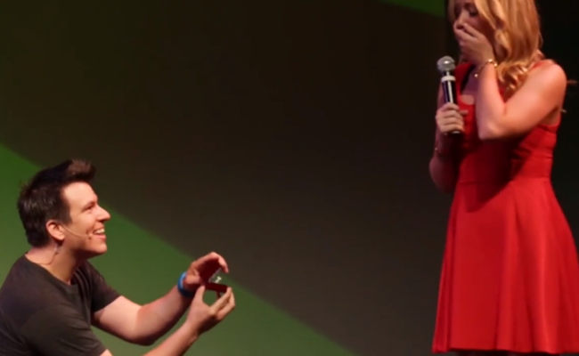 and Meg Turney on stage. Eventually, a woman in the crowd asked her a particularly personal question: “Are you going to get married?” As Doty gave an evasive answer, Defranco reached over, pulled out a ring box, and got down on one knee. The crowd went crazy, Doty said yes, and her parents rushed onto the stage to celebrate with her. The whole shebang has been posted on YouTube, where it has already received more than a half million views.Defranco and Doty have been together for six years, and the Twitters have been abuzz in response to the audacious proposal. Many YouTubers (including ShayCarl and John Green) have sent in their congratuations, Meghan Tonjes sent flowers, and Michael Buckley has agreed to get ordained so he can be the minister at the wedding. If he doesn’t kick it off by turning to the newlyweds and saying “hey girl hey! hey boy hey!” he will have missed an opportunity for greatness.