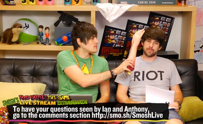 The live stream is pretty basic stuff: The creative duo are doing everything they can to keep their fans engaged, whether by answering questions or by eating the foods with which they might one day do battle or by shouting at their Wii Smosh Games style.