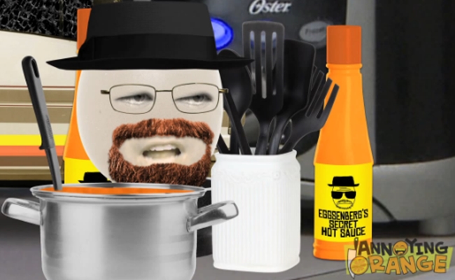 The latest episode of Dane Boedingheimer‘s web series is a typically cartoony romp intended for kids, with one important difference: the entire show is themed around Breaking Bad. As producer Bob Jennings explained, “We here at Annoying Orange may be doing a kids show – but gosh darnit we love us some Breaking Bad too!” The result is an episode about a character named Walter Eggwhite who gets himself into some legal trouble in the kitchen. Again, this is coming from a web series that usually gets most of its ammo from silly fruit puns.