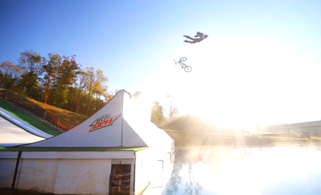 The slip n’ slide used in the video is installed at a summer camp in Ohio, which doesn’t have the mystical grandeur of Arches National Park but is still pretty rad (and open during the government shutdown). Of course, this being a Devin Super Tramp video, we get to see all sorts of merry folk dive down the apparatus, with plenty of backflips, mountain bikes, and bottles of Mountain Dew in tow.