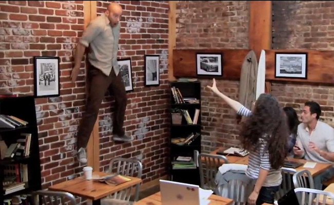 The Carrie video takes place in a run-of-the-mill coffee shop, where clever marketers rigged up a fake wall, sliding tables, and movable books. When the actress playing ‘Carrie’ is inconvenienced by a spilled cup of coffee, she reacts telekinetically, sending all of the previously rigged contraptions flying around the room. It’s an incredibly savvy promotional piece, even if I’m not convinced that the “customers” aren’t in on the joke as well.