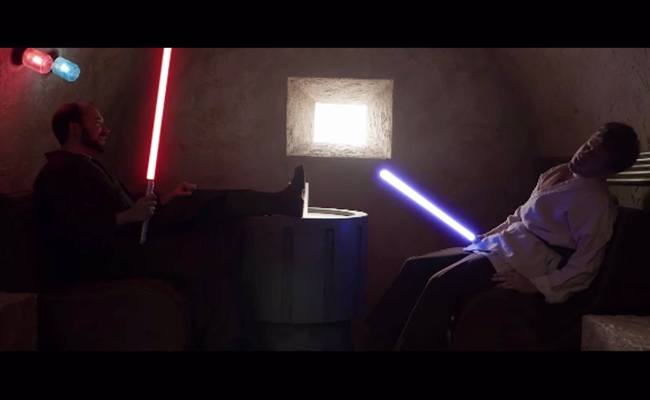 The videos are rolling out across four days during the week before May the 4th. The first one to see release was a lightsaber duel between YouTubers Corey Vidal and Craig “Wheezy Waiter” Benzine (with Shay Carl as the ornery bartender). It’s the fourth duel between Vidal and Benzine; the previous three can also be found on Vidal’s ApprenticeA channel.
