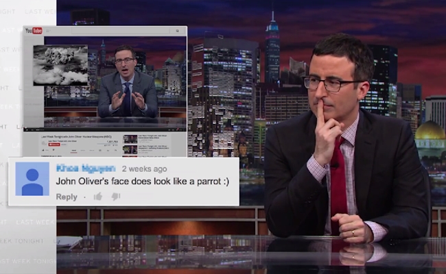 The new video is only available online, and it includes a number of comments typical of YouTube’s infamous commentariat. Oliver cracks jokes about his apparent resemblance to a parrot, gawks at a viewer who insults him in Spanish, and pokes fun at a user who calls him “brillent.”