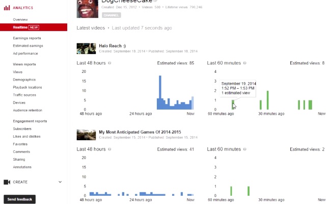 When you sign into the video site, you’ll have the ability to view minute-related analytics from your dashboard. Once you’re there, you’ll now see two charts of data available for your last five videos: an hour-by-hour analytics graph for the last 48 hours, and now a minute-by-minute analytics graph for the last hour. YouTube user DogCheeseCake already made a video showing off the new dashboard.
