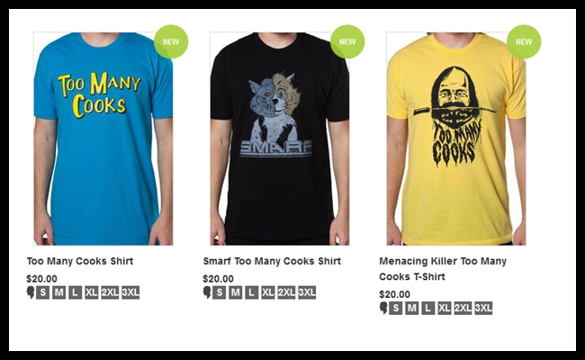 There are three official “Too Many Cooks” shirts available through 80sTees: One features the show’s logo, a second shows puppet/robot/last victim standing Smarf, and a third portrays the video’s murderous main character. All three are available in adult sizes for $20.