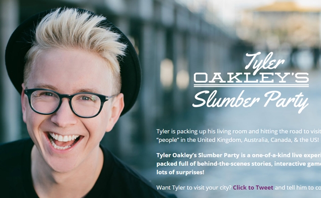 Tyler Oakley is taking his slumber party around the globe. The YouTube vlogger has announced a summer tour that will take him to Ireland, the UK, Australia, and several cities in the US.