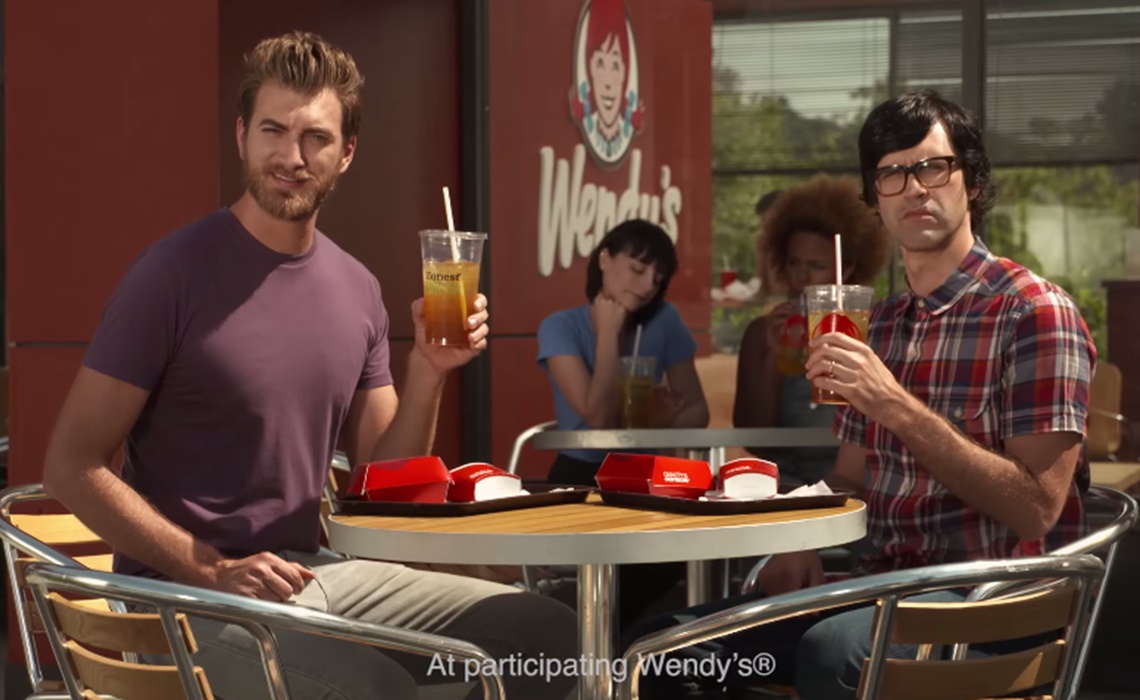 The video, sponsored by Wendy’s, begins with Rhett & Link sitting in a restaurant and drinking iced tea. When they overhear a pair of women talking about how much they appreciate honesty, they launch in a song through which they undo all their fibs, fabrications, and stretches of the truth. By the end of the video, though, they realize the two women were probably talking about Wendy’s Honest Tropical Green Teas.