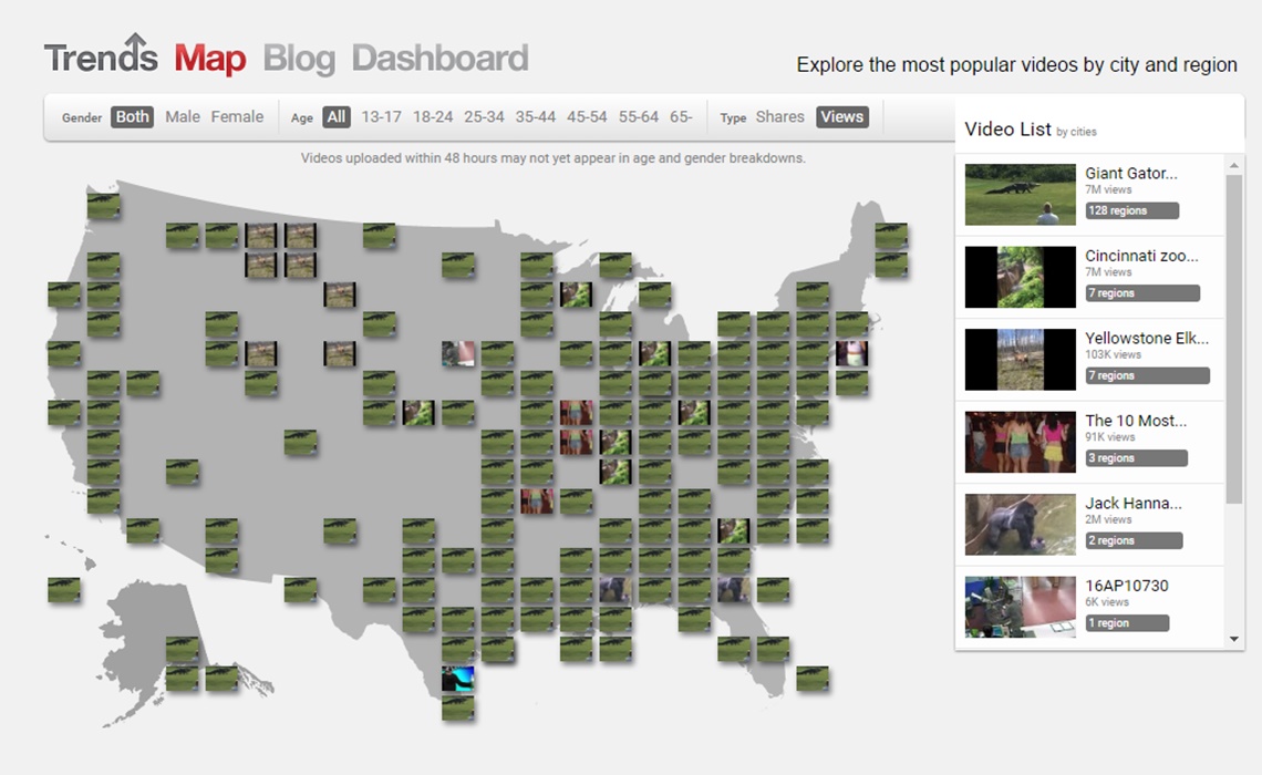 The Trends Map, which first launched in 2013, separated the United States into dozens of regions, with a top trending video in each one. Additional controls allowed map users to separate trending videos by age and gender. On a day to day basis, the map generally produced some interesting insights. Right now, for example, most of America is captivated by the video embedded below, in which a gator strolls through a Florida golf course; around Yellowstone National Park, however, viewers are more interested in this encounter between a woman and an elk