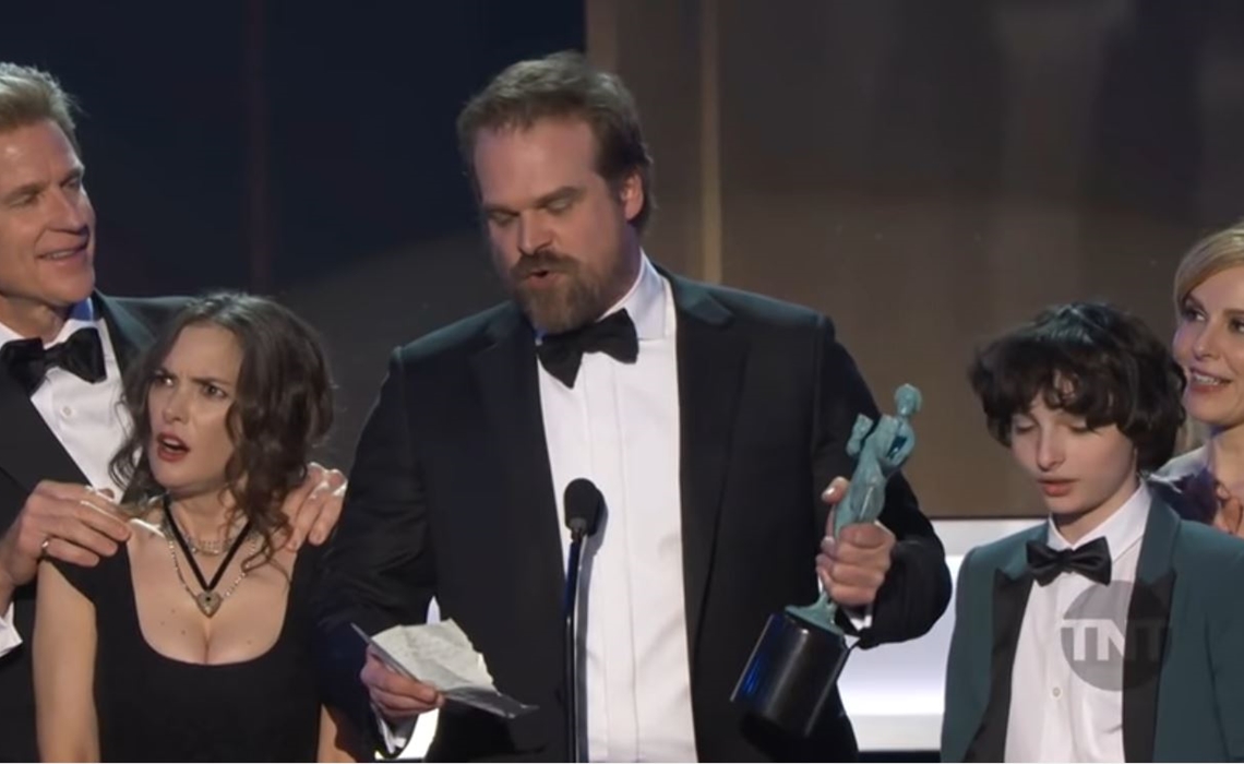 did receive four nominations for Manchester By The Sea and one for its hit series Transparent.Netflix’s huge bounty also accounted for one of the evening’s most memorable moments, as Stranger Things co-star David Harbour vowed in his acceptance speech that the cast of the 80s sci-fi show would continue to “shelter freaks and outcasts, those who have no home. We will get past the lies. We will hunt monsters.” And as Harbour spoke, co-star Winona Ryder looked on with a series of bewildered and blissful facial expressions.