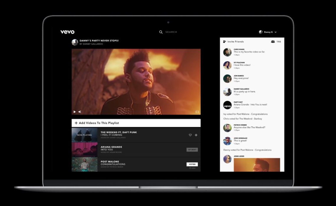Watch Party is a desktop-only service (for now) whereby users can invite an infinite number of friends to chat about music videos, vote on which ones they’d like to watch together, and then watch in sync from different locations. A total of 100 videos can be added to any queue. Vevo says its highest desktop traffic occurs during weekdays, when friends convene around music videos, and that’s why it’s piloting the service on computers.