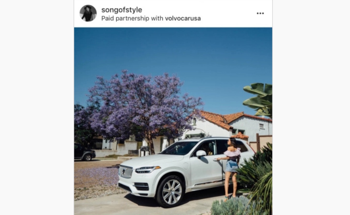 The new feature — which Instagram is testing with a select group of influencers before rolling it out to all users — is a tag through which creators can denote the sponsorships tied to their posts. The stylish Instagram star Aimee Song, for example, used the tag to disclose a deal with Volvo, as pictured above.