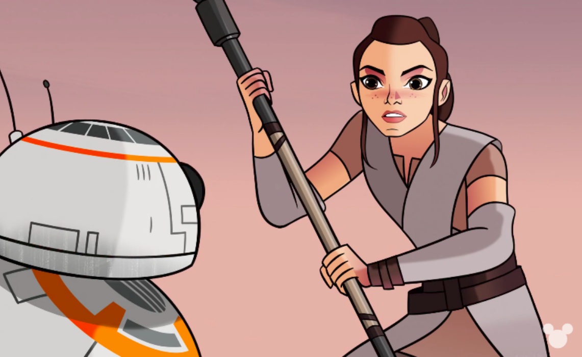 The clip in question features Rey, the protagonist of Star Wars: The Force Awakens, who is voiced in Forces of Destiny by her on-screen portrayer Daisy Ridley. In an action-packed sequence, Rey and the adorable droid BB-8 fend off a monstrous enemy in the desert. It’s quick, lightweight stuff that will serve as a nice appetizer for Star Wars