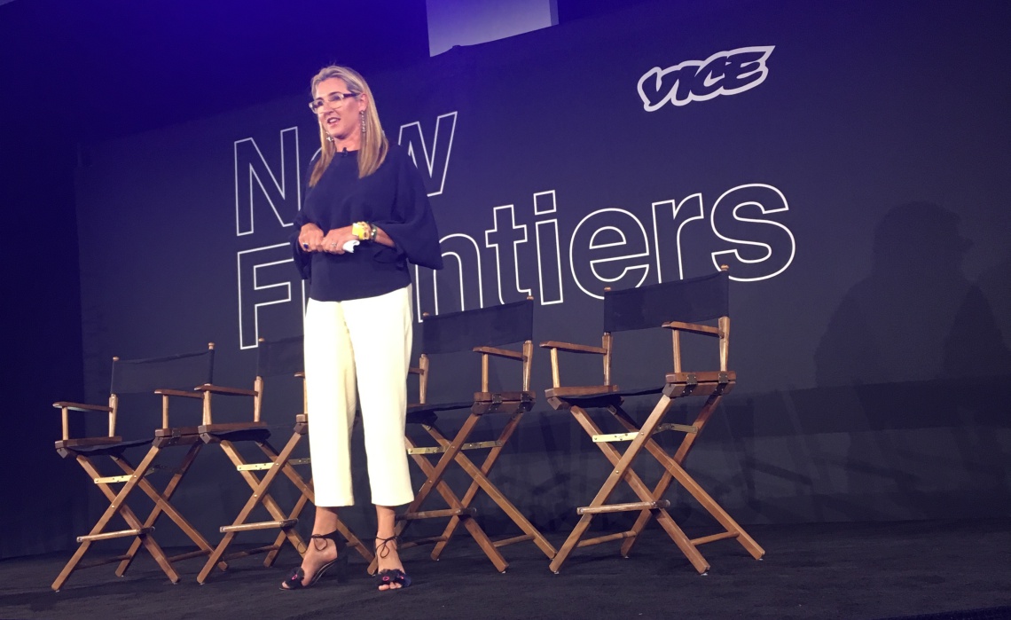 Smith had appeared at several of Vice’s previous NewFronts pitches, which featured party-like atmospheres. In March, however, he announced he would cede his CEO position to former A&E exec Nancy Dubuc, months after a scathing New York Times report shed light on a culture of sexual misconduct at the media company. Dubuc (pictured above) led off Vice’s latest NewFronts spiel, even though she won’t officially take over as CEO until the end of the month.