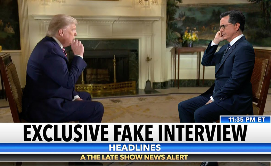 On Stephen Colbert‘s show Monday night, the late-night host conducted what he called an interview of Fox News interview of President Trump. At a couple of points in the video, Colbert was convincingly overlaid into the White House seat previously occupied by Fox News interviewer. His replacement audio track lobbed decidedly different questions to Trump, whose answers were amusingly–if falsely–“distilled” for comedic effect.
