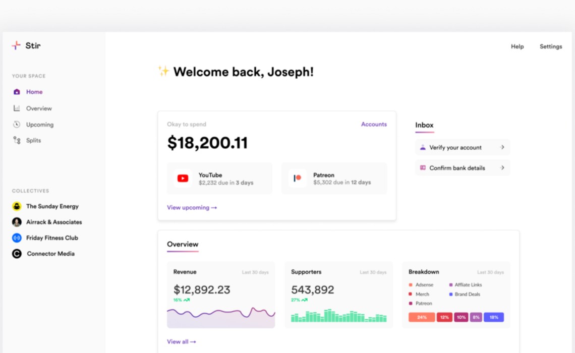 Today, the startup Stir — a platform that enables digital creators to manage their various revenue streams, organize their analytics, and share funds with collaborators — unveiled its beta product and announced a $4 million seed round.