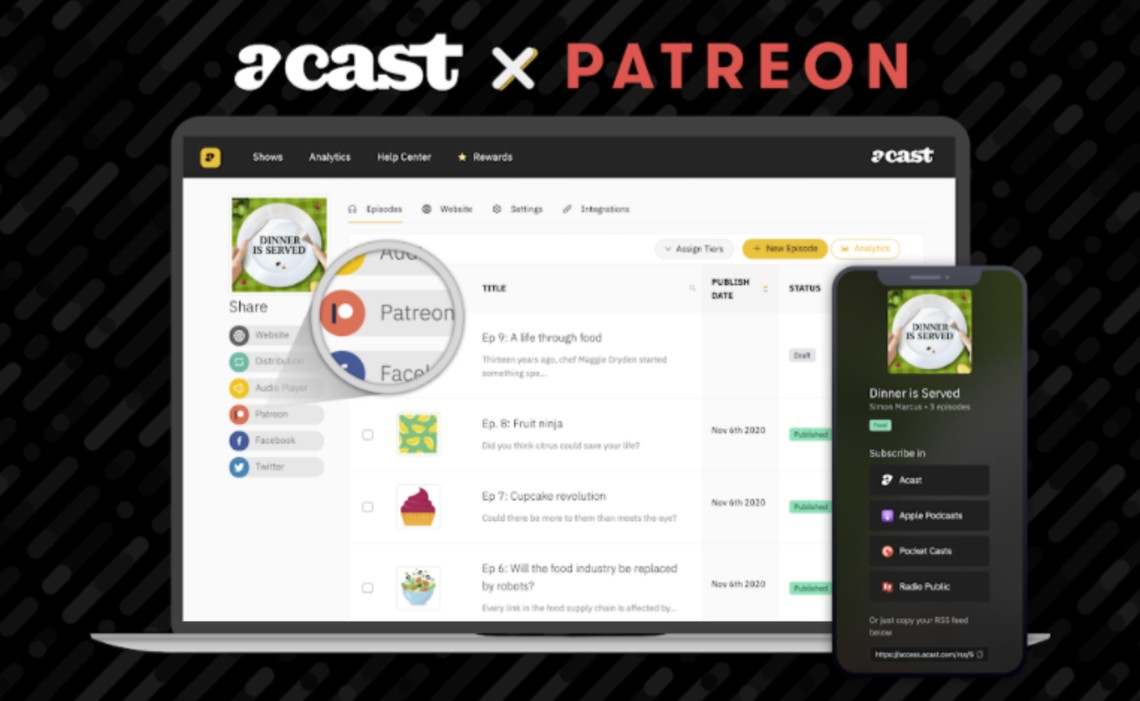 Podcast-hosting and monetization company Acast has integrated with Patreon for a new partnership that will enable creators to more seamlessly distribute their paywalled programming across most podcast platforms.