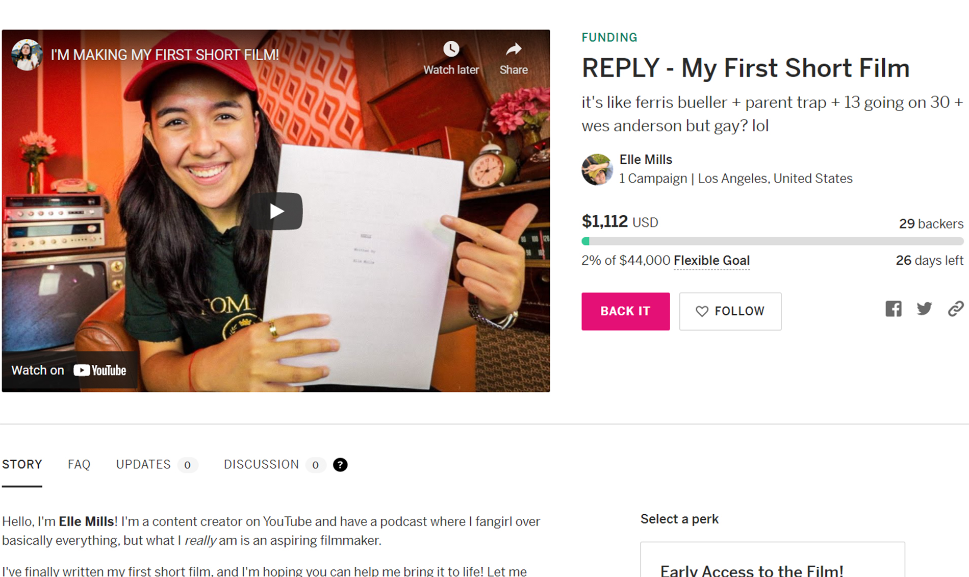 Longtime content creator Elle Mills is raising funds to produce her first short film.