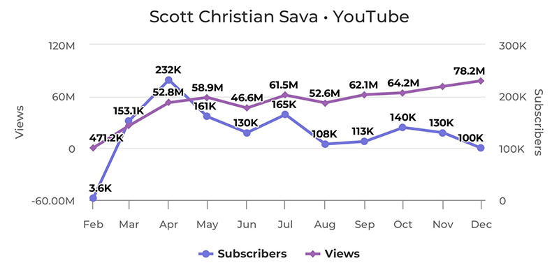 Sava began sharing his art on the platform in 2020, and since then has amassed more than 800,000 followers. He expanded to YouTube in 2021, and is doing even better there, with 1.5 million subscribers and traffic surging to nearly 80 million views per month in December.