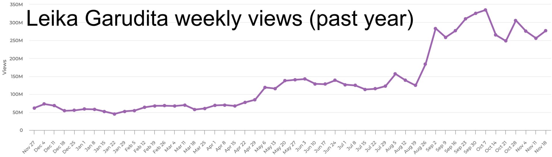 Of that group, Garudita has had the most staying power. The kid-friendly creator has become a familiar face in our rankings over the past three months, as she’s boosted her average weekly viewership from about 150 million views all the way up to 300 million and beyond.