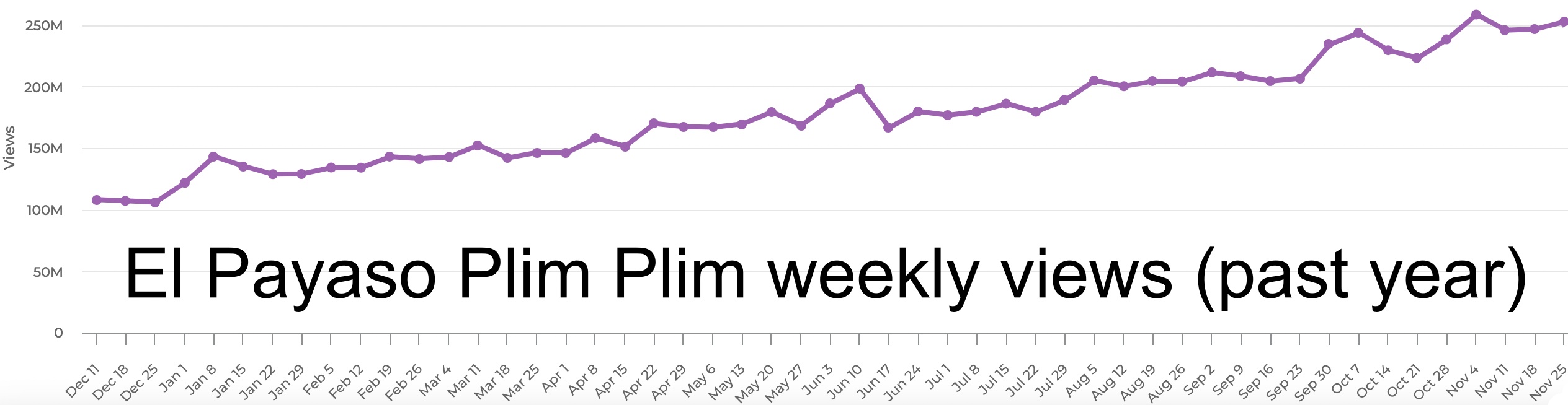 All the while, El Payaso Plim Plim is continuing to bring his painted face to more and more viewers. By getting 252.6 million weekly views during the last full week of November, Plim Plim cracked the 250 million view mark for the second time ever.