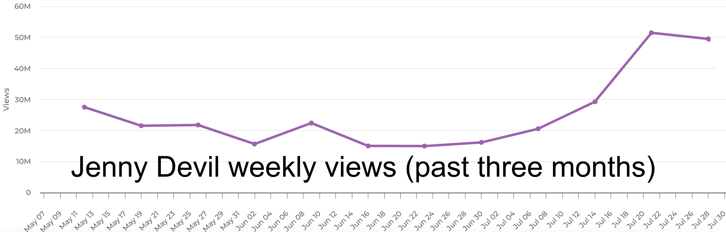 Jenny Devil is the most obvious example. Based on her handle, one would think she’s out of place in the God-obsessed world of YouTube Shorts, but she finished 34th in July’s Global Sub Top 100 after collecting 840,000 monthly subscribers. And you better believe she has some KPop Demon Hunters content mixed in with her other fare.