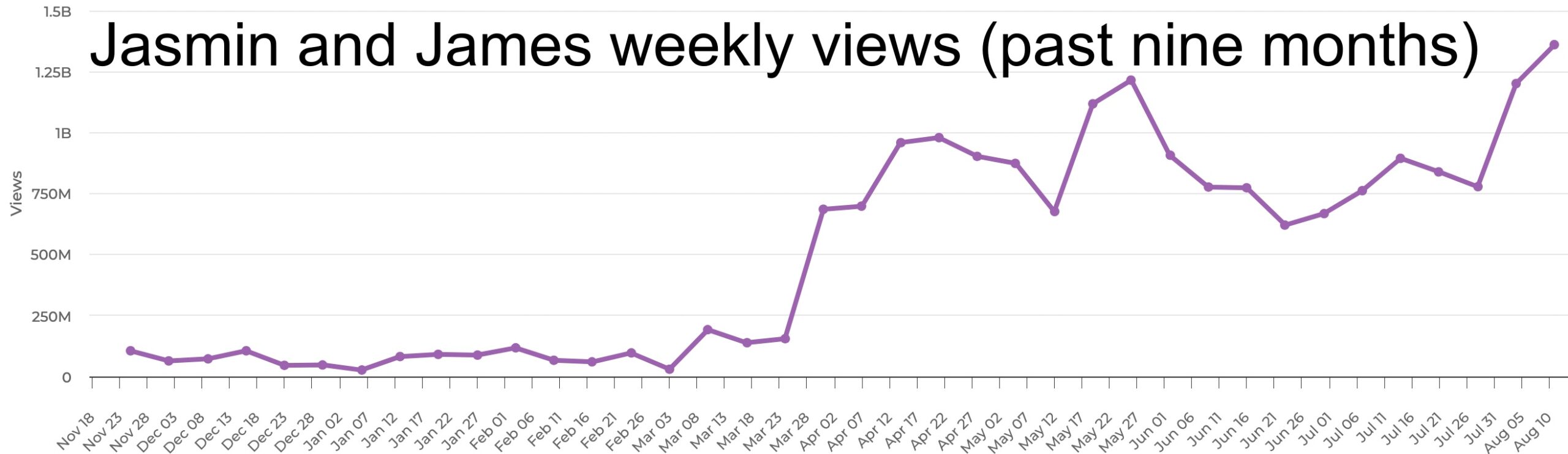 YouTube’s policies encourage couple creators to crank out videos as quickly as possible. Before the Shorts view-counting change took effect, Jasmin and James hovered around 200 million weekly views on their primary YouTube channel. Then, faster than you can say “abracadabra,” their viewership exploded.