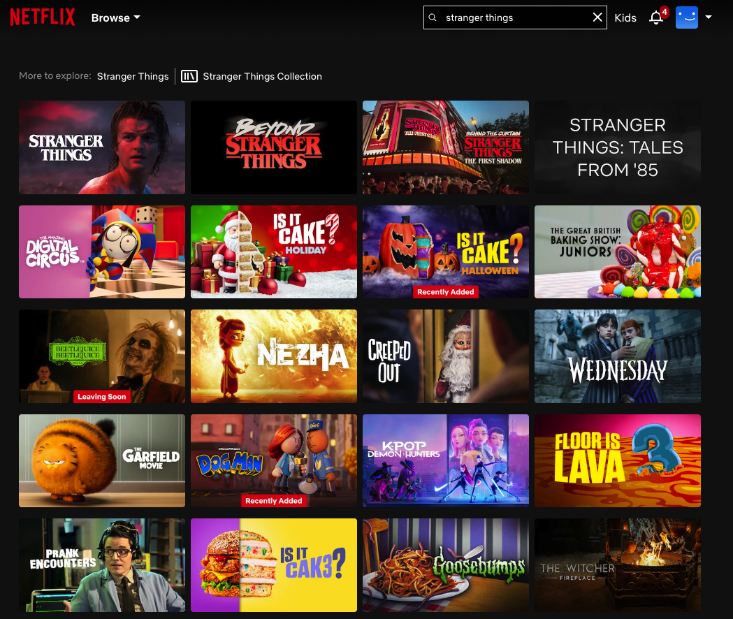 Netflix’s podcasting strategy up to this point has been uneven. Though the streamer produces companion shows for hit franchises like Stranger Things, those podcasts are mostly distributed through platforms like Spotify and are hard to find via the Netflix interface. Here, for example, is a screenshot of the search results for “stranger things,” with no add-on pod to be found.