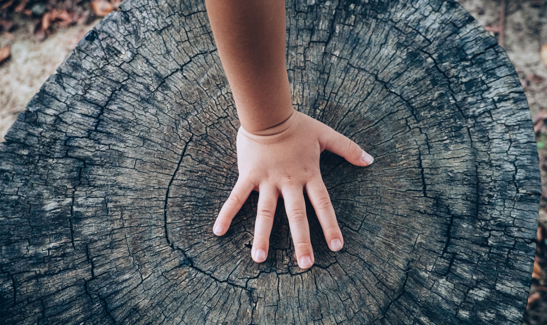 Tiny hand of a kid touching the texture of old tree trunk in the nature. Healthy and active lifestyle. Kid embracing and exploring the nature. Kids love nature