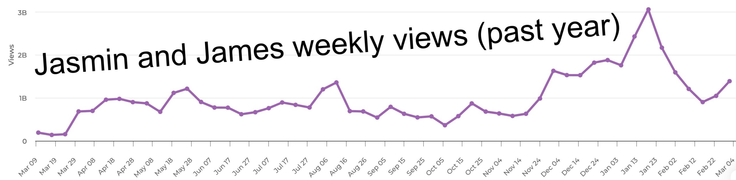 And yeah, that works pretty well for them. Since the start of 2026, Jasmin and James’ viewership volume has been absolutely massive, and they’ve even taken a few turns at the front of our Global Top 50 chart.