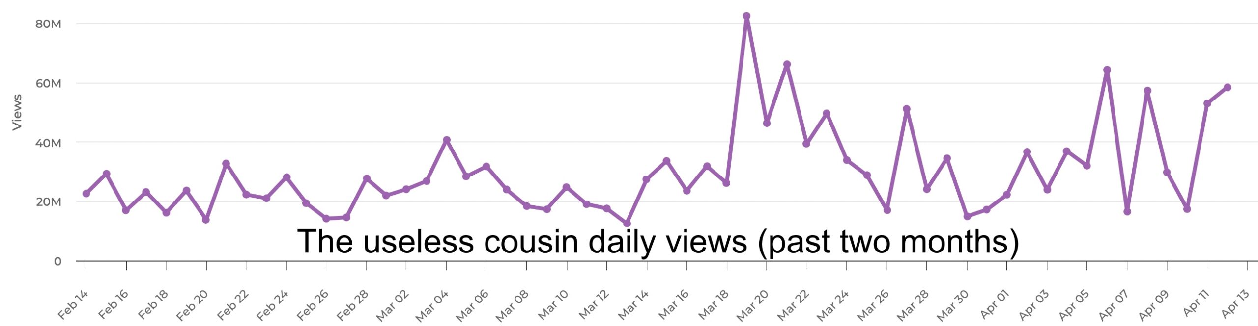 In the wake of that channel’s upward move, we’ve noticed several other Indian family channels that have added animalistic representations to their videos. The Useless Cousin is a channel with a mean name and a focus on family-friendly hijinks. Recently, it added a yellow dog mascot as well, and that decision helped the Indian hub collect 297.1 million weekly views. The 41st-place represents a new high-water mark for The Useless Cousin.