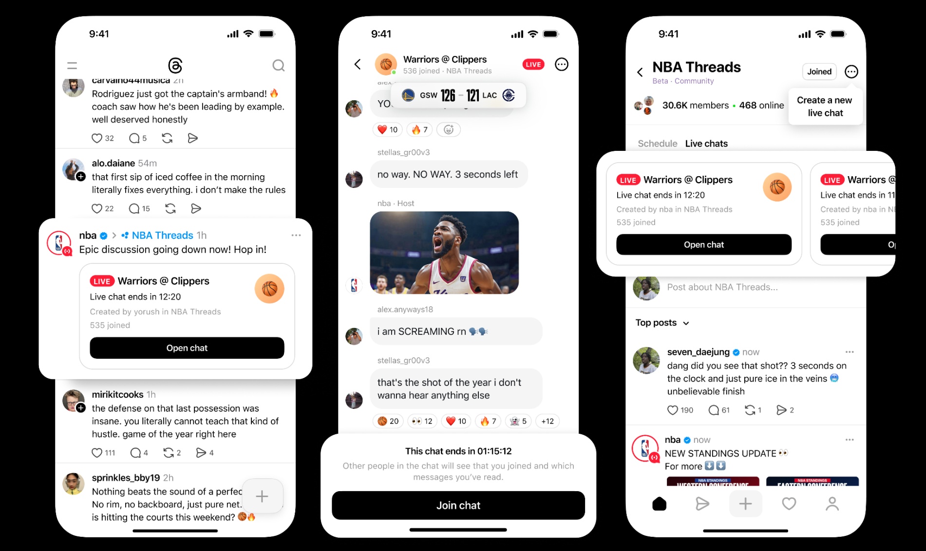 By navigating to the NBAThreads community, users will be able to find the earliest examples of Live Chats on the platform. As the hoops action carries on — with Threads providing score updates in real time — NBA insiders like Malika Andrews and Rachel Nichols will host Live Chats tied to specific games and matchups.