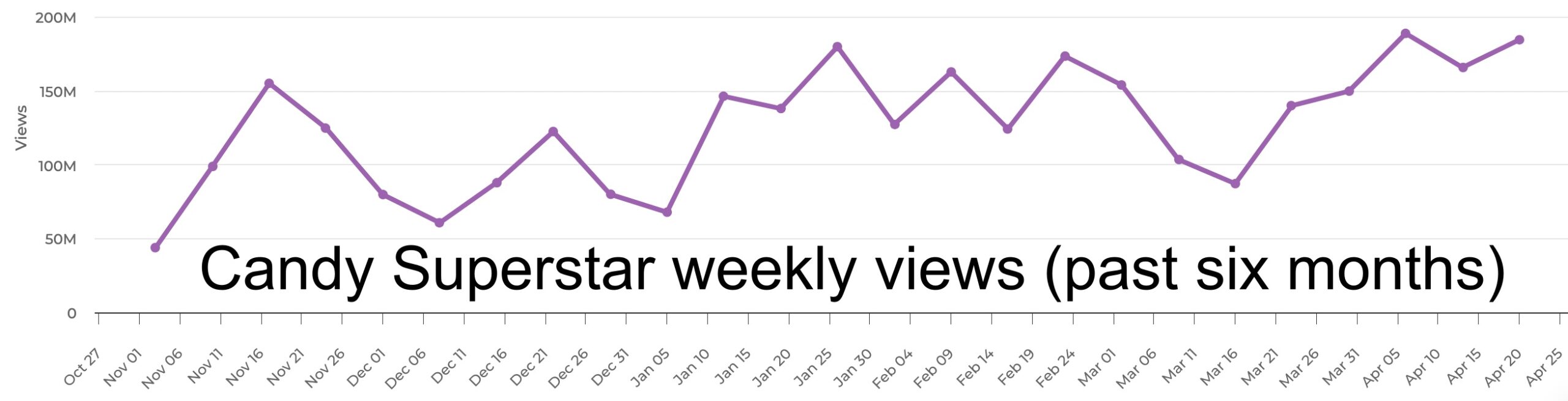 Those reactions pushed Candy Superstar back into the Global Sub Top 50. She added 500,000 weekly subscribers to claim 15th place in our ranking. And her viewership is nothing to scoff at, either. It’s as high as it’s been at any point in 2026.