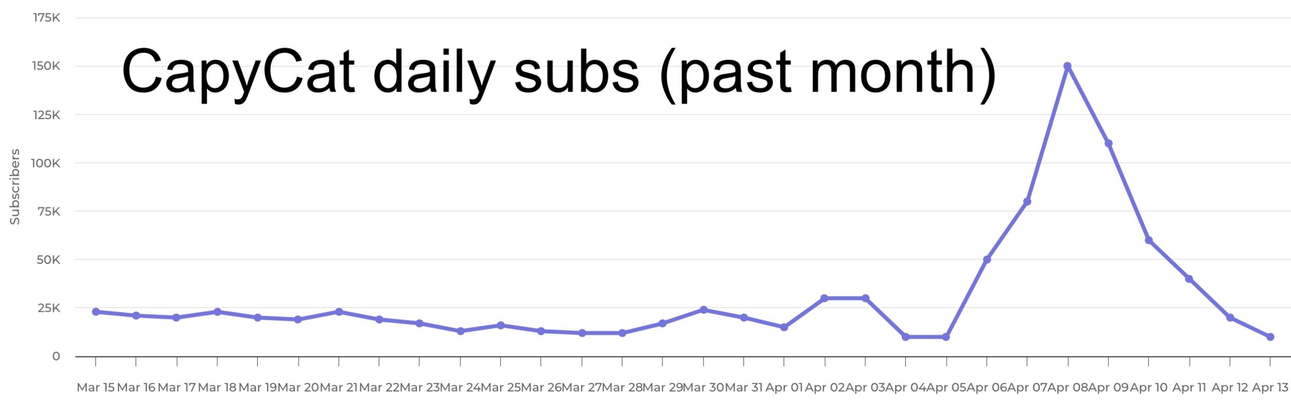 In the U.S. Top 50, Technoblade finished one spot ahead of CapyCat, a truly bizarre channel filled to the brim with AI slop. But the low quality of the channel’s uploads hasn’t stopped it from bringing in 510,000 new subscribers in a single week. As the below graph shows, much of that volume came during an early-week spike.